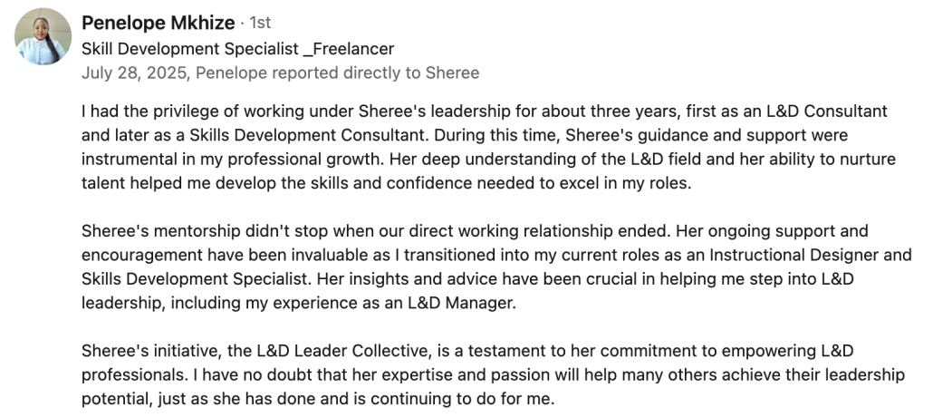 Connect with me on LinkedIn to learn more about my work and see how I help L&D professionals like you step into leadership.