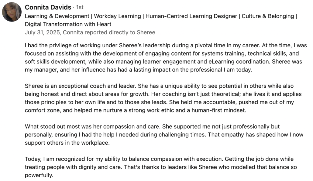 Hi, I’m Sheree Comninellis. I’m an L&D Executive, mentor, and leadership strategist with 17+ years of experience building teams and developing leaders across industries.